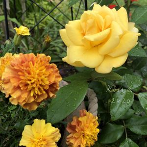バラ💛キープ スマイリング(開花14号) (о´∀`о)💕 この冬 もしかして枯れちゃった?位💦 自然のゲンコツ剪定になっちゃった( ꒪⌓꒪) その後ちゃんと新しいシュートが3本出て来てくれました🙌エライ 又々その後1本だけ風?雨?で 根本から折れちゃってたけど(T-T) お隣のマリーゴールドは ご近所から頂いた色が変わる 大人色のストロベリーブロンド🎶 今は黄色寄りです💛🧡💛