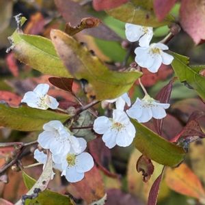 葉が紅葉している中でユキヤナギの小さな花がところどころに咲いていました🤍✨ 季節外れの可愛い開花