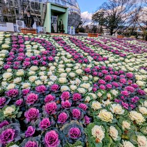 グリーンセンターの展示温室前にはハボタンで『DINО』と ディノは恐竜を意味するダイナソーの省略形 さすが恐竜王国ですね🦖 手前は足跡です😄