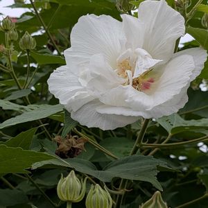 🍀酔芙蓉🍀 お向かいさんのスイフヨウ、20年前位からな〜毎年立派に咲いています。 1日花で咲き始めは白花、 午後から薄いピンクになってきて、しぼむと濃いピンクになります。 ①〜④は朝 ⑤はさっき12:30頃写しました。少しピンクになり始めましたね。 今日は曇りで小雨がパラパラ、暗くてわかりにくいかもしれませんが・・・🙇 しぼんだ花はもうすぐポトンと落ちます。