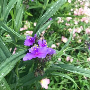 ヒルザキツキミソウと一緒にいました。 ムラサキツユクサでしょうか?生物の教科書でよく見かける名前ですね☺️