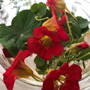 ナスタチウムさんがベランダから溢れて大暴れしていたので少し整理した時に 間違ってカットしちゃった蕾たち サラダ用に花や葉っぱを入れていたボールに浮かべておいたら… やっぱり咲いてくれた❣️ 本当にこの子たちはエネルギーに溢れていて 素晴らしい😄💪✨