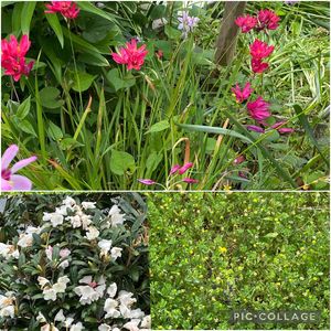 ⬆️イキシア ↙️ご近所さんの庭の片隅にシャクナゲの様ですが?? ↘️裏の空き地にコツブツメクサが👀💕