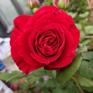 マイローズに蕾が2つ。なかなか咲かないので剪定出来ず…赤が可愛くて咲くのを待ちきれず投稿しちゃいました。無加工でこの赤さ❣️