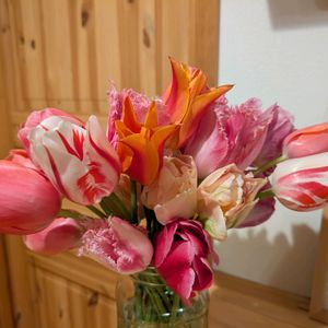 25年4月撮影。球根掘りでゲットしたものを切り花に。ユリ咲きのオレンジ色のチューリップはバラの香りがします。進化してますね。この内来年はいくつ咲くか答え合わせが楽しみです。