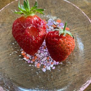 初取りいちご🍓 赤くなるのをじっくり待っていたら誰かに齧られてしまったみたいだけど甘いいちごになりました😊 洗って娘の口の中にポイ。 齧られたところはちゃんとカットしましたよ😅