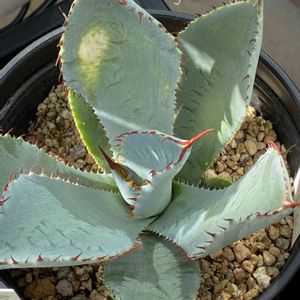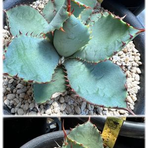 おはござ⸜( ˙꒳˙ )⸝☀ 明日から雨が続くから 今日のうちにいっぱい☀️浴びるんだよ😎 ブルーグレーの肉厚の葉に赤い鋸歯が とっても上品なグアダラハラナ様❤️ 毎年スクスク成長してます( * ॑˘ ॑* ) でも、ここら辺の大きさでギュッと ボールみたいにしたいんだけど どうしたらできるんだろ?🤔 アガベを形良く育てるのって難しいね 🏷️毎月7日はアガベの日
