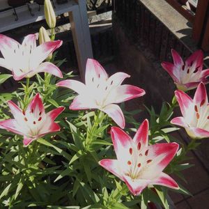 スカシユリ 透かし百合 🍀アイライナー (可睡ゆりの園) アジアディック(すかしゆり) 白色花弁の縁に赤紫が可愛い 蕊も薄い赤紫です 昨年ゆり園からお迎えして咲きました 三種の蕾が控えています!楽しみ! (孫の🏠)