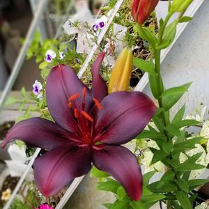 スカシユリ ブラックチャーム❤️ やっと咲いたぁ‼️ ブラック好きの私、球根頼んで植えるの忘れてて…いつ、植えたんだっけてなかんじ。 もっと黒~いユリ、想像してたんだけど… まっ、いいかっ😊