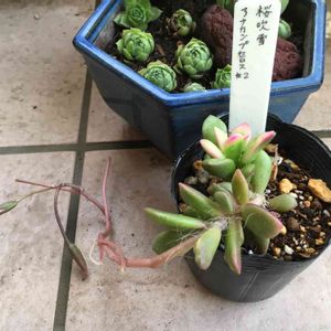少し寒くなってきました! 鉢底が穴なしなので小さなプラ鉢に寄せましたスキスキだったかな? モルガニュームは聖夜つづりに似てるかな? 多肉は名前覚えるのにたいへーん😊