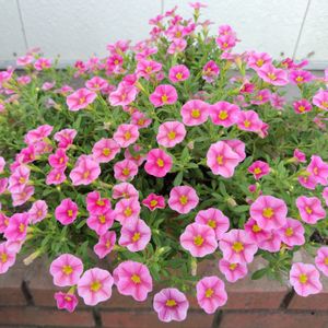 カリブラコア達が元気です♪ ミリオベルプチホイップが枝垂れるように咲いています🌸 ミリオンベルバターポップコーン🌼この夏、ダメージもなくまとまって咲いてくれました! スーパーベルストロベリースライス🍓ふんわり咲いています✨ しばらく暖かい日が続きそうなのでもう少し楽しみます😊