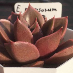 パーパソルム×白雪姫 錦玉園さんの交配です。 写真のようにつるってしていて、渋めの赤がとても綺麗です。ちなみにこの苗は、錦玉園さんがイベント中に「これオススメだよ〜」と言っていましたが、お客さんみんな「うーん」といって、その時は誰も買っていませんでした笑 その時はまだ紅葉していなかったし、パーパソルムって好き嫌い別れるから万人ウケする多肉ちゃんじゃなかったのかもですね(⌒-⌒; ) でもこういう万人ウケしなそうな交配も大好きなので、これからも渋めの多肉とか錦玉園さんには作っていってほしいです(*´꒳`*) それにしても、パーパソルムも白雪姫も、どちらもこんなに渋めの赤になったりしないのに、、、。 交配の不思議なところですよね〜