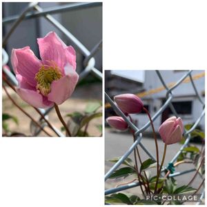 駐車場脇の花壇🌷 モンタナ ルーベンス満開です 風にふわふわと揺れる姿が可愛いです😍💕