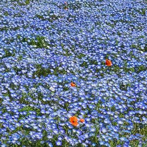 海と一面のネモフィラ ポツポツとナガミヒナゲシのオレンジ