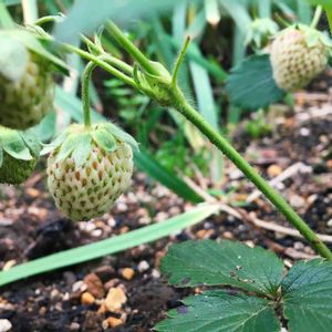 庭の野良イチゴ しっかり実になってます😆💕 でも大きくなるのに凄く時間掛かってる💦ベランダの四季なりイチゴの方が早いぞ〜。