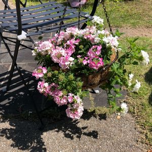 ラタンハンギング インパチェンス&ペチュニア 朝キレイにこんもりしていたのに次見ると ダラっと。慌ててジョウロでたっぷりと…❣️ 戻りました。よかった💕💕 その後、雷が鳴り、大荒れのような感じになりました。天候不順です。