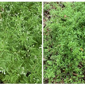 おはようございます😃 五月晴れの気持ちいい朝です。 野原もすっかり緑に覆われました。 今日は子供の頃、遊んだ懐かしい草です。 左がヤブジラミ。 右はヤエムグラです。 ヤブジラミは小さな白い花を付けています。 セリ科の草で、上に立ち上がる前はセリと間違えそうな草です。 花の後にできる小さな実がひっつき虫です。 この実が名前の由来だそうです。😅 ヤエムグラは八重は茎に輪になって付く葉っぱの姿のようです。 これは葉っぱも茎も全てがくっつきます。 通学路で、道端に生えたこの草の塊りを前を歩く友達の背中にくっつけて遊びました。 蔓状で軽く、50cm以上の長さでもとても良くくっつきます。 しかも軽くて気づかれません。 みんなも無視して、教室で笑われたりしたものです。😊
