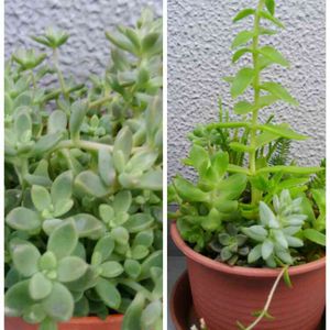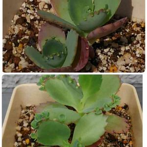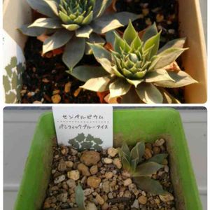 上⇒GreenSnapマルシェで買ったリメ鉢に、やっと植え替えしました❗ 悩んだあげく仕立て直ししてないけど月花美人にしました🤗 下⇒夏に葉焼けして、ほぼ、枯れてしまったセンペルちゃんの上の子に、ロゼッタ形の葉が生えてきました😍⤴️ これから寒くなるけど、頑張って✊😃✊元の姿に戻ってくれるかなぁ✨⤴️期待しちゃう🎵