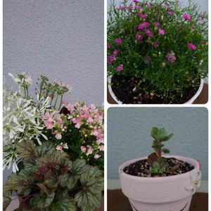 🌹バラの香りのネメシアちゃん、見つけました✨ ヒューケラも、やっと出逢えた✨ 右上は、一目惚れ✨😍✨売り場に名前書いてたのに忘れてしまった😵💧 右下は、GreenSnapマルシェで購入したリメ鉢に、葉挿しの赤ちゃん👶から成長した(とても成長の遅い子)名前のわからない多肉ちゃんです🎵
