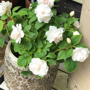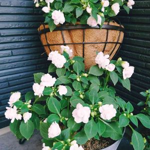 八重のインパチェンス 白飛びしちゃってますが、実際は淡いピンクで可愛らしいです🌸 直射日光にしばらく当たると元気がなくなるので、なるべく軒下の日陰になる所に置いてます☺️