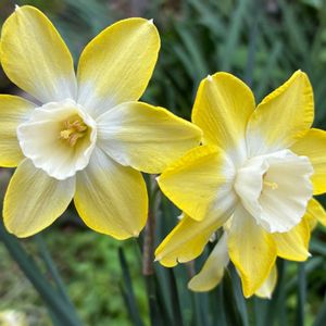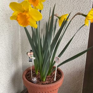 ミディサイズの水仙ピピットちゃん。 開花から数日経つと中心から色が抜けてこんなオシャレなコに変身します✨ 数年前に2個の球根を植え付けて、これまで最多花数は5輪でしたが、少しずつ分球しているようで今年は7輪咲いてくれました。 水仙は痩せた土が好きだから肥料あげないようにしています。今年もほったらかしでいきます。 今日は雨降りで風も強いので、花もち抜群のこのピピットちゃんたちとももうお別れかな…