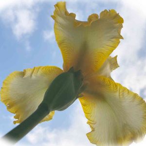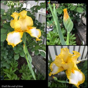 ジャーマンアイリス(ザッツオールフォークス) 黄色に白の入った大きな花びらが綺麗です。 (*'▽'*) 後ろに写ってる蕾は、ピェールドゥロンサール です。💕