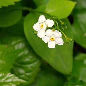 立亀葉草(タチカメバソウ) ムラサキ科キュウリグサ属の多年草。山地の湿ったところに生える。茎は柔らかく高さ20〜40㎝になる。葉は卵形〜広卵形で長さ3〜5㎝、鋸歯はなく、細かい毛がある。葉柄は基部の葉では長く、上部では短い。花期は5~6月。枝先の花序に白色または淡青紫色の花を開く。花冠は5裂し、花筒上部に黄色っぽい付属体がある。雄しべは5個、花筒の上半部につく。 茎が直立し、葉が亀の甲羅に見えるのでこの名がある。 出典『山に咲く花』『春の野草』『四季の野の花図鑑』