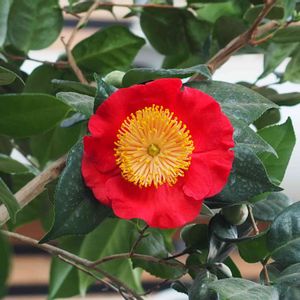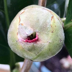 蕾から覗いてる💦 咲くのは3月下旬になる巨大輪の肥後椿です。