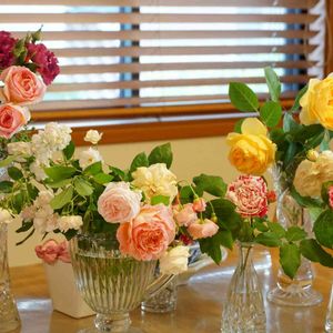 薔薇バラばら🌹✨🌹✨🌹✨ わんこお散歩でお会いするご近所の奥さまがベテランロザリアンでいらして、私が薔薇栽培を始めたことを伝えると、お庭に咲いている薔薇を惜しげもなく切ってくださいました🥰感謝感激💕 早速家中の花器を集めていけて記念撮影✨✨✨ 何という華やかさと麗しい芳香💖 20年以上は経っていると思われる株から咲くお花はお見事の一言に尽きます✨ わが家のバラは長くて1年ですから😂本当に今始まったことをつくづく実感します😆✨ 薔薇の名前は覚えてる限り記しておきます✨ ERアブラハムダービー グラハムトーマス ソンブレイユ マダムイザックペレール つるサマースノー コーネリア ブラッシュノアゼット ペルルデパナシェ バフ ビューティ 粉粧楼etc.