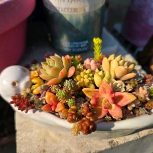 お久し振りです😁 植えるのに忙しくて、サボってました😅 1枚目 娘が作った植木鉢に寄せ植えしました 2枚目 やっとこんもりした寄せ植えができました😉 3枚目 憧れのセリンセ キウイブルーが咲きました