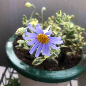 こんにちは! ようやく斑入りブルーデイジーが咲き始めました。 大好きだから真面目に水やりをしてダメにしてました😭昨年GSを始めてから、乾燥気味ということを知り、こころを鬼にして(笑)水やりを控えめにして、夏冬を越しました。 花が咲き始め感無量🤣 シレネ ユニフローラも咲き始め斑入り三昧でベランダでニヤニヤしています😆