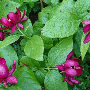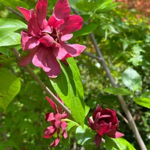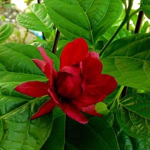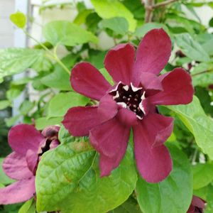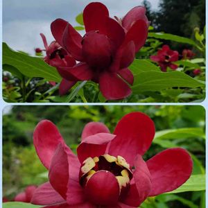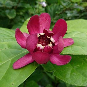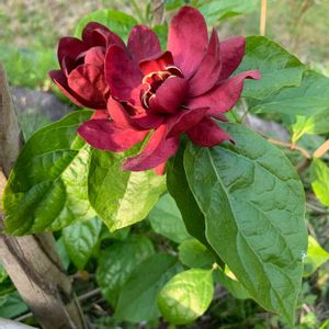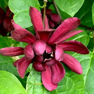 ♥️🤎カリカンサス ハートレッジワイン❤️🤎 2022.5.10投稿の蕾が咲きました。 10㎝ほどの大輪とはいかずメジャーで測ったら8.5㎝でした。 緑の大きな葉っぱにワインレッドの花が綺麗でした。 🏷金曜日の蕾たち に参加させていただきます。 香り嗅ぐのまた忘れました。 後日追記します。 2022.5.14 香りを嗅いできました。 やはり残念なことにナツロウバイの血を引き継いでしまった様で、ほとんど香りなしでしたが、一輪だけ仄かに香りました。 ※黒花ロウバイと夏ロウバイの種間交配により生まれた新品種。 開花期: 4〜6月