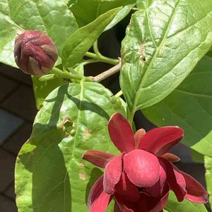 ♦️カリカンサス♦️ "カリカンサス ハートレッジワイン" 別名: スウィートシュラブ カロライナオールスパイス パン屋さんの入り口の鉢植え。 ※クロバナロウバイと夏ロウバイの種間交配により生まれた新種です。 開いたら10㎝ほどの大輪になるそうで、また見に行って来ます。 フルーツのような甘い香りも嗅いできましょう。 🏷真っ赤な火曜日 🏷あっ火曜日 に参加させていただきます。 ロウバイ科 開花期: 4〜6月 *クロバナロウバイは2021.9.17に投稿しています。