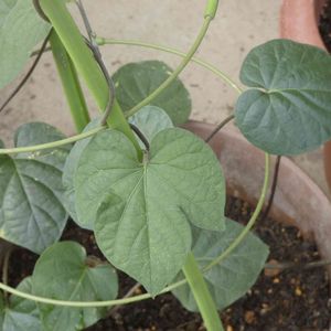 「琉球朝顔」 🏷チーム·ブルー◆青い花を育てよう 《3回目》 3日前に🆙した小さな葉が、勢いよく成長しツルも一気に伸び始めてきました。日中、テラスの気温も、かなりの暑さ☀他の植木鉢の植物たちがクッタリ💦の中、この琉球朝顔だけが元気に育っています。