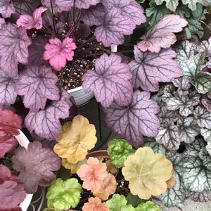 ヒューケレラ、ヒューケラの寄せ植え。 花がそれぞれ違ってカラフル。