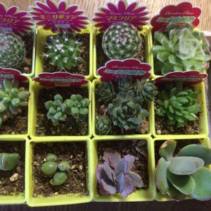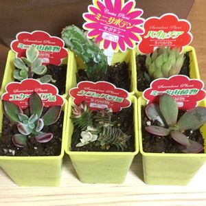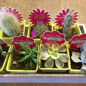 隣の市のダイソーで購入したものたち。 行動圏から外れてるお店だから初めて行ったけど、入荷間もない植物たちにテンション急上昇♡ 後列真ん中のウチワサボテンは、明らかに一度鉢を倒されたらしくて根っこ出てるけど、乾かして植え替えるから、まぁいいか、と。