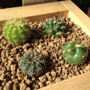 ダイソーサボテンの木箱植え ブカレンっぽいヤツと ペンタカンサっぽいヤツ、 ヒカダマっぽいやつ、 左上はノトカクタスの何か?