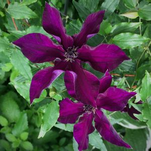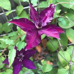 クレマチス 「ソワレ」。2020年に苗を購入して地植え。ビロード調で赤っぽい紫、花の形が整っていて好き。 ビチセラ系。新枝咲きなので、何も考えず冬に地際で切れば良いので、私向き。 キンポウゲ科 センニンソウ属 Clematis 'Soirée'