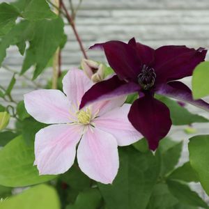 クレマチスソワレも開花しました クレマチス桜吹雪とコラボしてます 渋い色のソワレと可愛らしい色の桜吹雪 対照的な2つですがどちらも引き立てあってるかな!? ソワレは好きなクレマチスランキング上位なのですが今年はあまり咲かせられないっぽいです