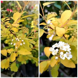 コデマリ ゴールドファウンテン🌱 黄色い葉っぱのコデマリさん🌿昨日は蕾だったけど、今朝は小さな可愛い花が咲いていました😊🤍✨先日植え替えしたばかりなので無事に花が咲いてくれて良かったです🤍