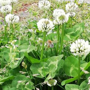 白詰め草と西洋蜜蜂🐝 私は仕事が休みだけど 🐝はお仕事www 花粉団子までいかないが 後ろ足に花粉が付いていました。働き者💕