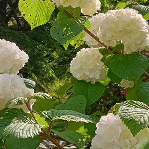 オオデマリ(大手毬)多分😅 車で峠を越えた山道の途中に、白い花が集まった毬のような形のこの花が咲いていました。 この花は雄しべと雌しべの退化した装飾花(飾り花)で実は付けないそうてす。近くにツツジも植えてあり、2〜3羽のアゲハ蝶が、周りを楽しそうに飛んでいました。