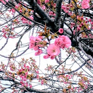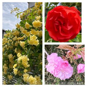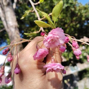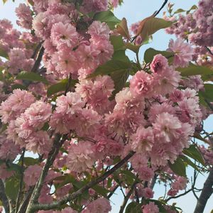 2025.5.8 ようやく家の八重桜満開🌸 いつもは、4月下旬に 今年は遅め モコモコした桃色の花びらが可愛い八重さんです🤗 家の西側 道路沿いの八重桜🌸 ①下がって咲いた花アップ ②南西の空をバックに📱 ③引いて全体 桃色🩷桃色 家の南側 前庭の八重桜🌸 ④西の空をバックに📱 面白い形に咲いていて😉 下の葉の細いタイプの紅葉とコラボ😉紅葉せず同じ色。名前を知らず… やっと咲いてくれてホッとしました~🤗