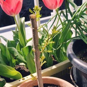 ☀️ポカポカですね😊 朝倉山椒の苗木から新芽が出てきました🙌 🌷🌷って夜になると花、閉じるんですね😌 知りませんでした💦