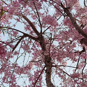 こんばんは。 お庭の枝垂れ桜が満開です。 桜の間の薄暮の空から 月も覗いてます。