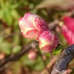 おはようございます。 快晴の朝、 やっと、お庭のボケも プクプクしてきました。
