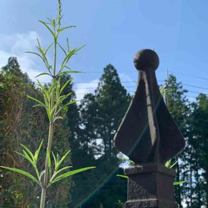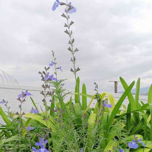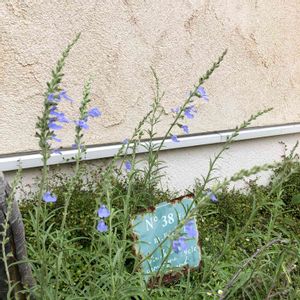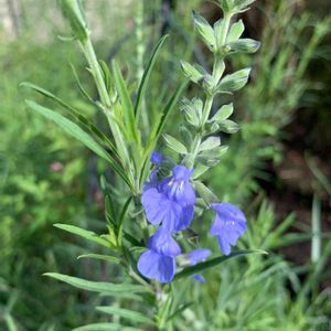 サルビア アズレア🌱 咲き始めました 後ろの真っ直ぐ伸びた枝は、2m近くあります 一番花は、自由奔放なグンニャリ曲がった枝につきました グリーンは、メニエス サバンナ 🌱です