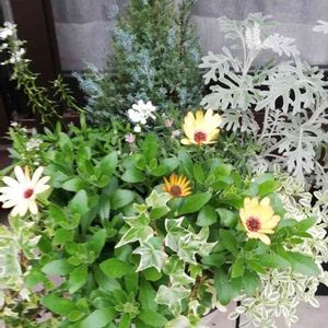 今日のお花 🌿アイビー🌿 コニファー・アイビー・オステオステルマム🌼・シロタエギク・などの寄せ植え♡ 昨年のpic です。