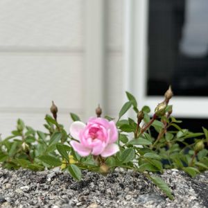 地植えの、つるのミニバラ🌹夢乙女 前を通る人から、可愛い❣️とよく言われます🤭 ピエールさんより人気が高いの🎶 4枚目は、鉢植え🪴の夢乙女と、手前はバレリーナ💕