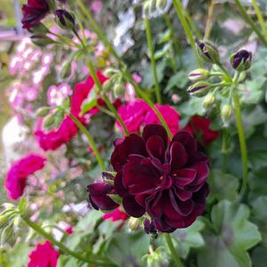 玄関前の板壁ガーデンです🏠 ①アイビーゼラニウムのトムキャットが開花しました️🖤 赤黒、八重咲きでお気に入りです。 ②ゼラニウムのマルカダホワイトです。 中央のピンクラインがステキです😍 ③ミニバラのボルドーコルダナ🌹 ボルドーではなく真っ赤なバラでした。 ミニつるバラの夢乙女も満開です🌸